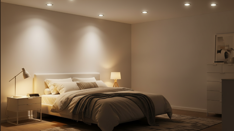 - Phòng ngủ: ánh sáng vàng 3000K tạo sự thư giãn, ấm cúng.