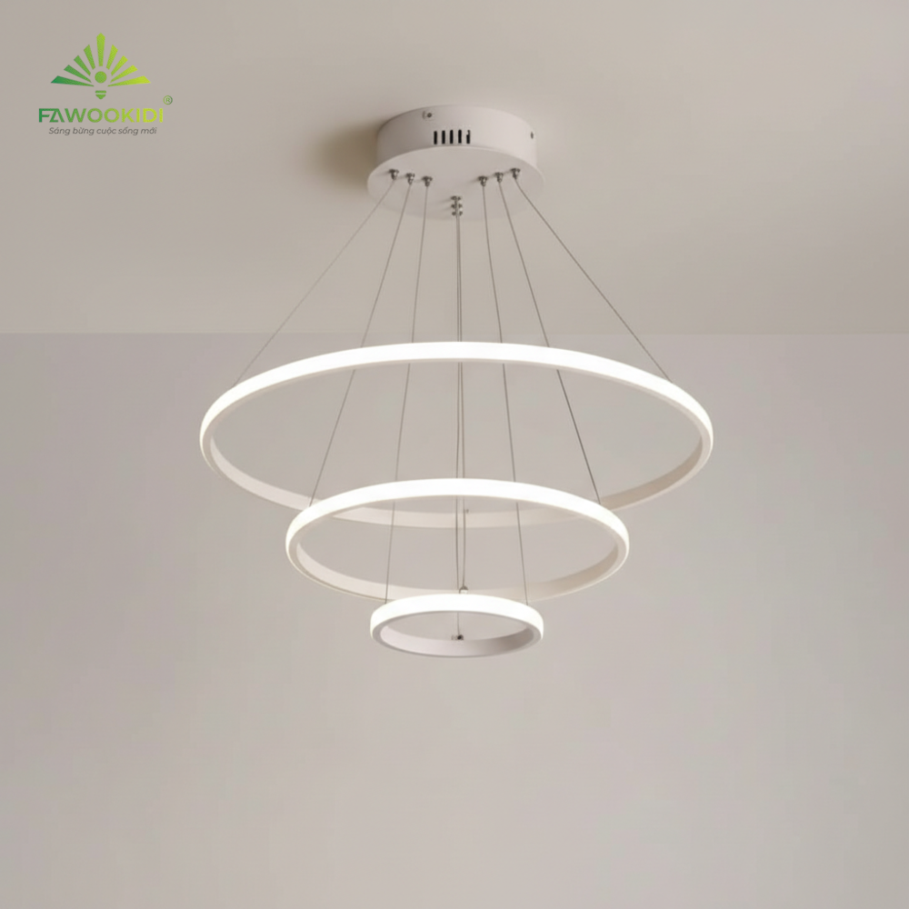 Cấu trúc ba vòng LED xếp tầng tạo hiệu ứng thị giác đa lớp, giúp lấp đầy khoảng không trần cao một cách cân đối. Kiểu dáng 1 line trắng thanh mảnh mang phong cách hiện đại, dễ dàng kết hợp với nội thất minimalism, contemporary hoặc luxury. Đèn không chỉ chiếu sáng mà còn nâng tầm giá trị thẩm mỹ của không gian.
