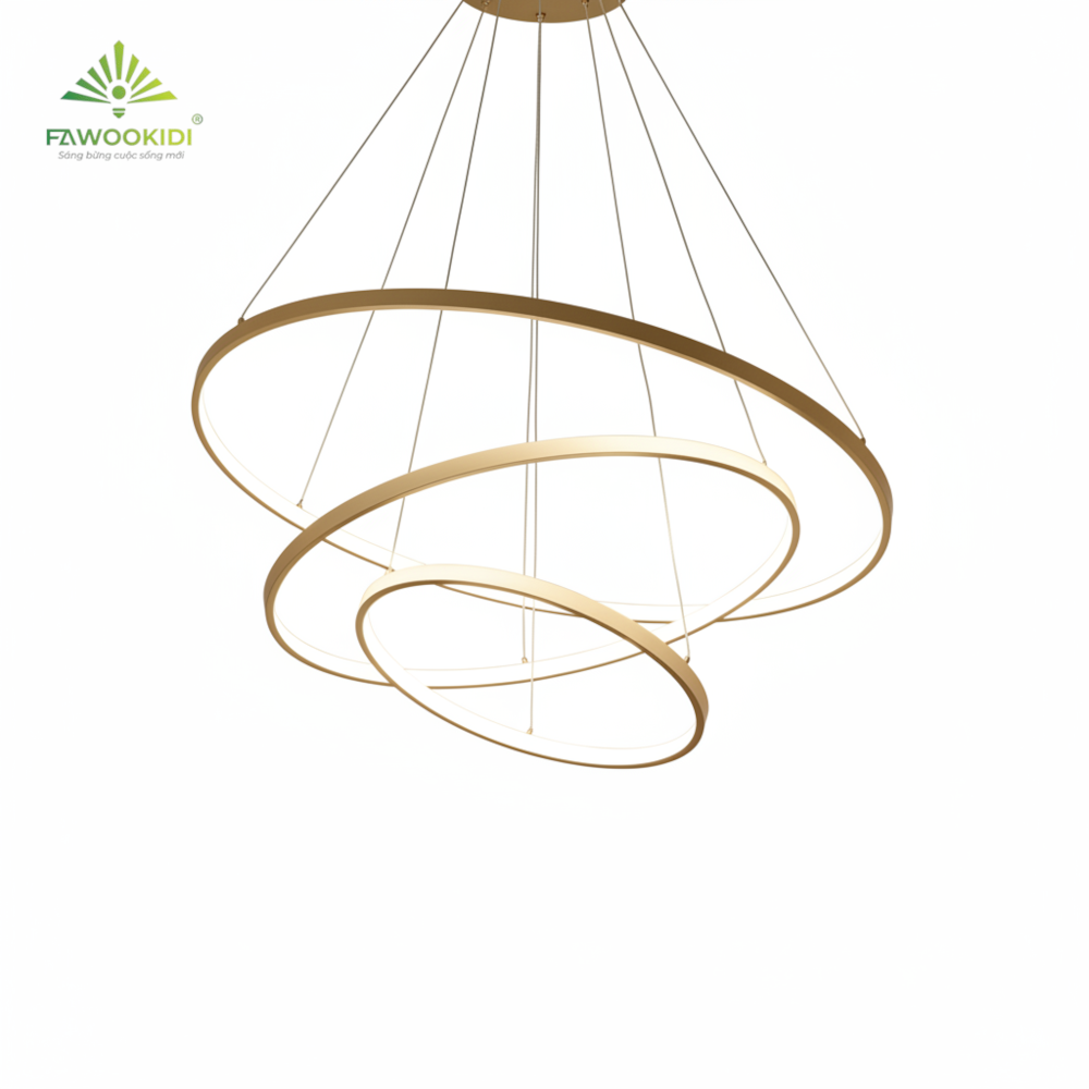 Đèn thả 3 vòng tròn golden DT5107 là dòng sản phẩm cao cấp từ Fawookidi Việt Nam, nổi bật với cấu trúc 3 vòng tròn lồng ghép nghệ thuật kết hợp cùng công nghệ chiếu sáng hiệu suất cao 72W. Với sự hòa quyện giữa chất liệu nhôm mạ ánh kim sang trọng và lớp Silicone tản quang mềm mại, sản phẩm không chỉ là điểm nhấn thẩm mỹ mà còn đảm bảo chất lượng ánh sáng đạt chuẩn chuyên gia cho mọi không gian kiến trúc.